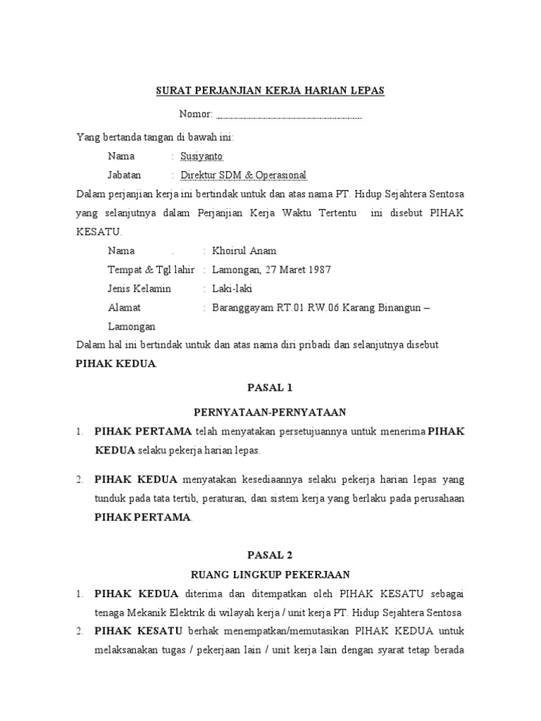 Doc Contoh Surat Perjanjian Kerja Harian Lepas Perwitasari Alirsyad Academia Edu